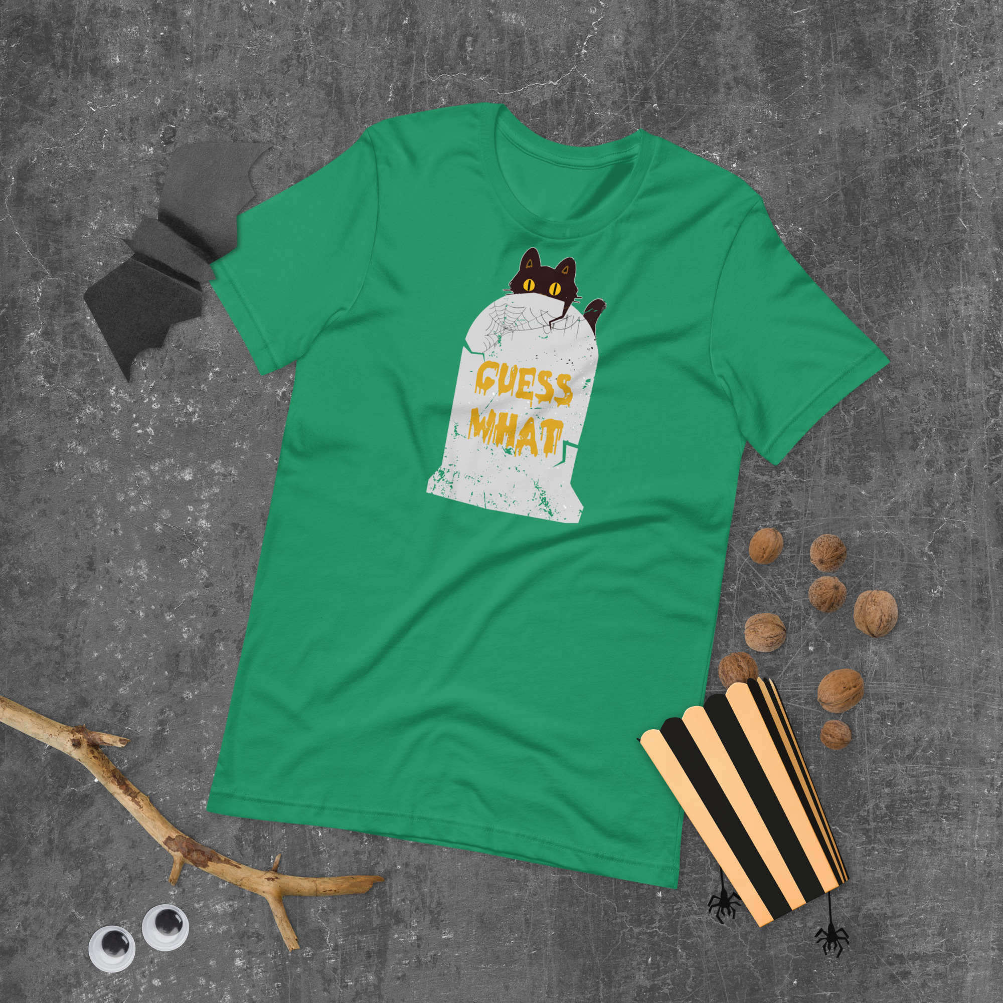 The Halloween shirt is a dark and spooky piece of clothing printed with a chilling design. The main image features an eerie graveyard scene with a tombstone at its center. The tombstone is adorned with haunting engravings and emits an ominous vibe. Behind the tombstone, a frightened black cat with an arched back and wide, glowing eyes can be seen, adding an element of mystery and superstition.